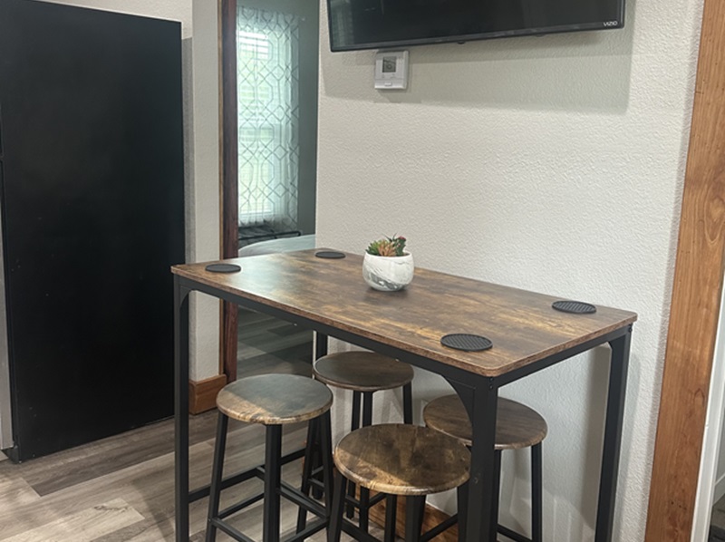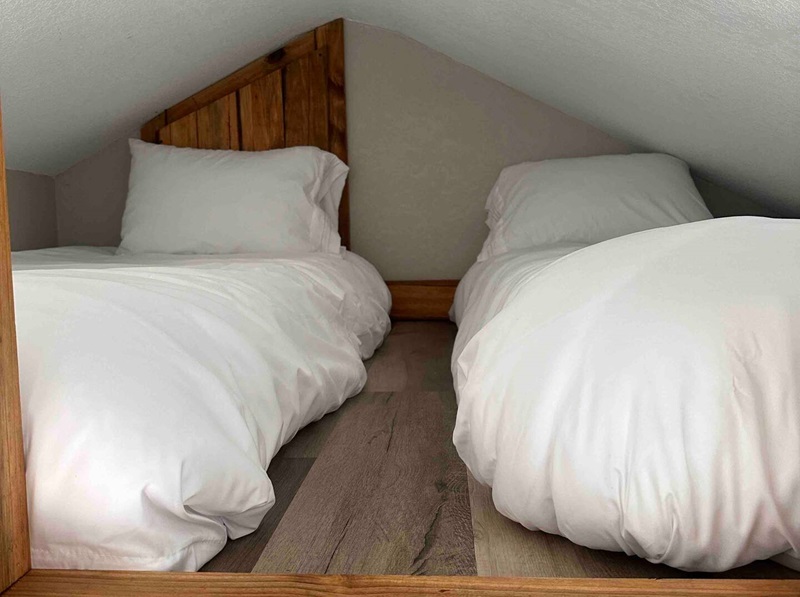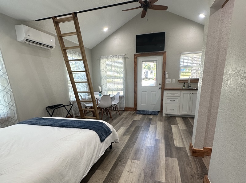 In the loft sleeping area, there are 2 additional twin memory foam mattresses. A small round dinette rests in the corner next to the windows for plenty of natural lighting.