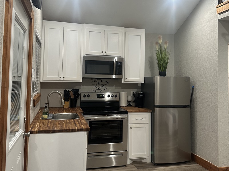 You will find all of your major full-sized appliances such as a refrigerator, oven, stove, and microwave in the fully stocked kitchen. Utensils, cookie sheets, pizza pans, and wine glasses are provided along with linens for the beds and the bathroom.